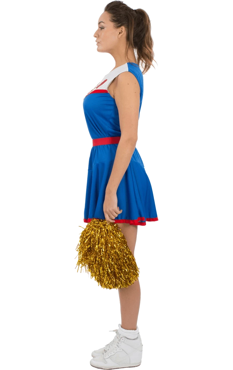 Cheer on the home team in our vibrant American Cheerleader Costume! This stunning blue and red outfit even includes a pair of tinsel pom poms, adding a touch of sparkle to this fantastic fancy dress idea.