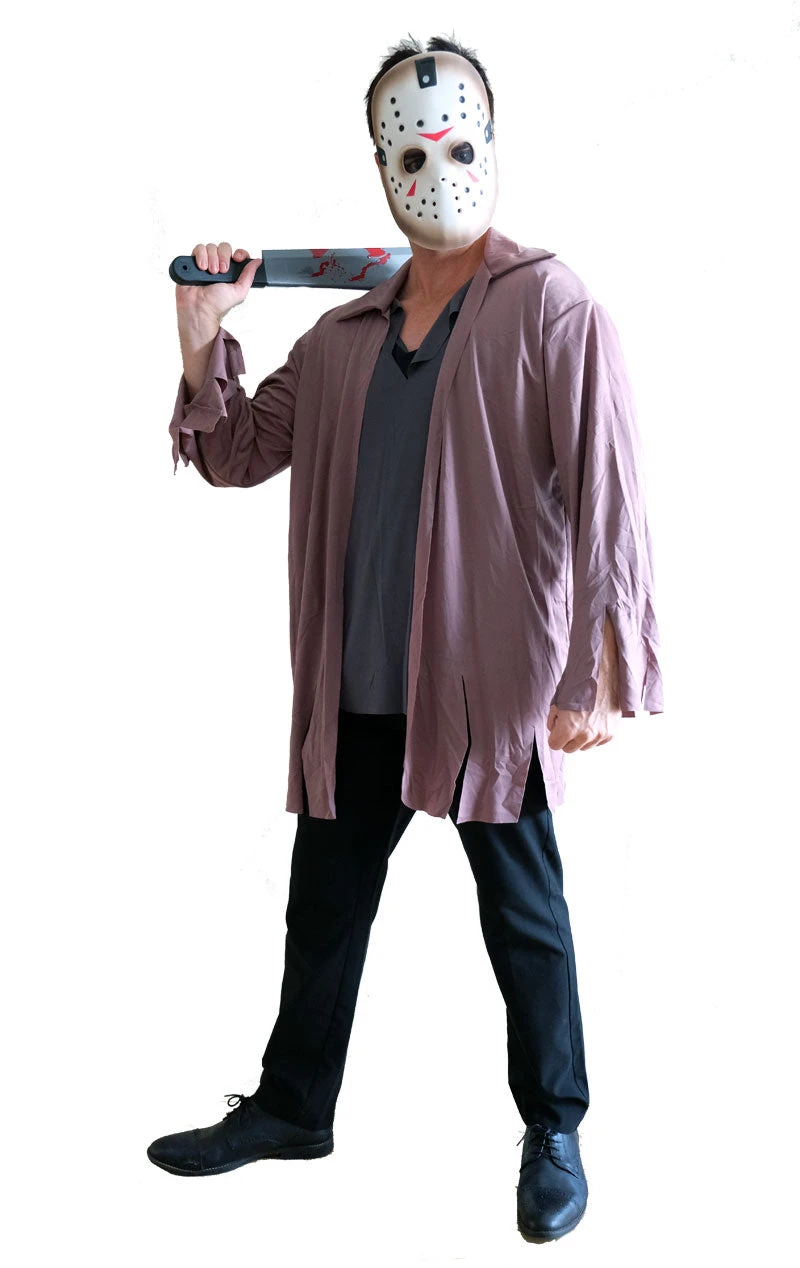 The Jason Voorhees Costume comes with a ragged beige shirt with tears on the bottom of the top and sleeves. To ensure no-one will ever know your true identity as you slaughter away, you can hide behind the Jason mask, which is also provided with the costume.