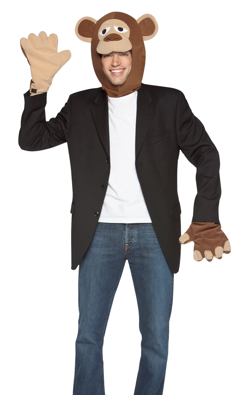 The Adult Monkey Costume Kit includes a headpiece with the monkey face and ears on top, with a cut out for the face. It also includes a pair of fun monkey-hand gloves.