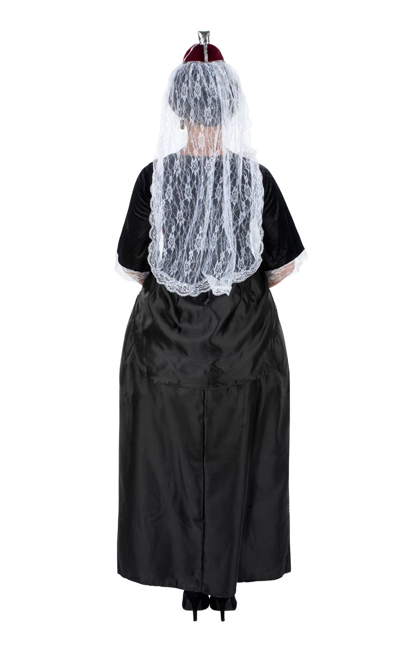 This Adult Queen Victoria Costume comes complete with a long, short sleeve black dress with laced sleeves. The dress features a blue sash and a few medallions. Also included is a stunning red headpiece with a veil attached.