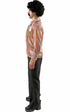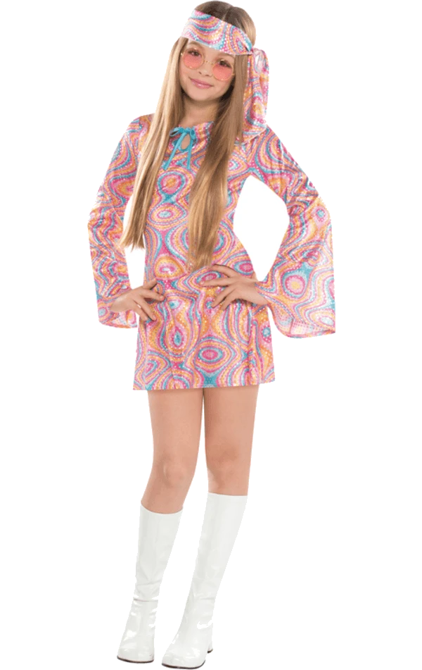 The costume features a sparkly psychedelic printed minidress with tie up detail at the collar and matching headband to tie around the forehead. This dress has flared sleeves and is made of a lightweight polyester material to ensure you do not get too hot at your party.