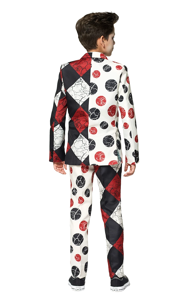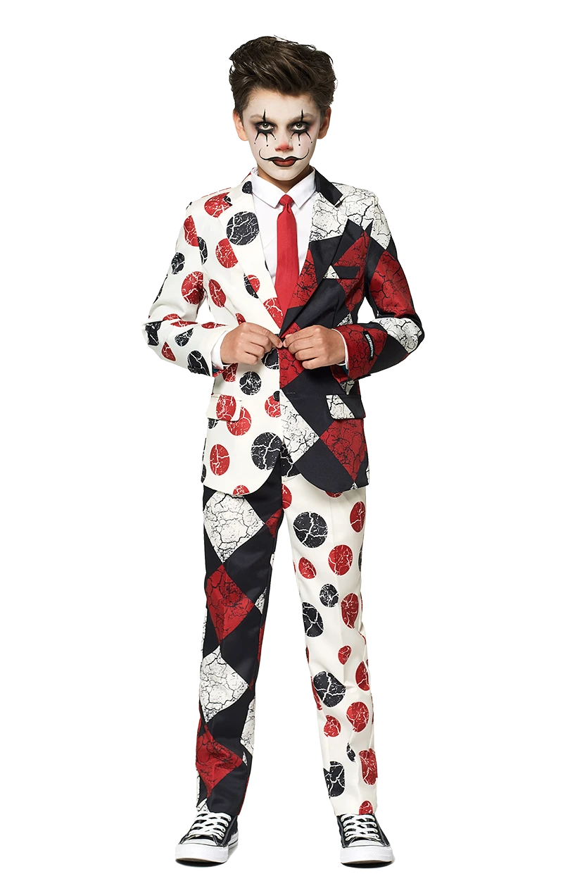 It’s a multi-patterned red, black and white two-piece suit with a red tie, the spot-on Halloween outfit to let everyone know he means serious deadly business.
