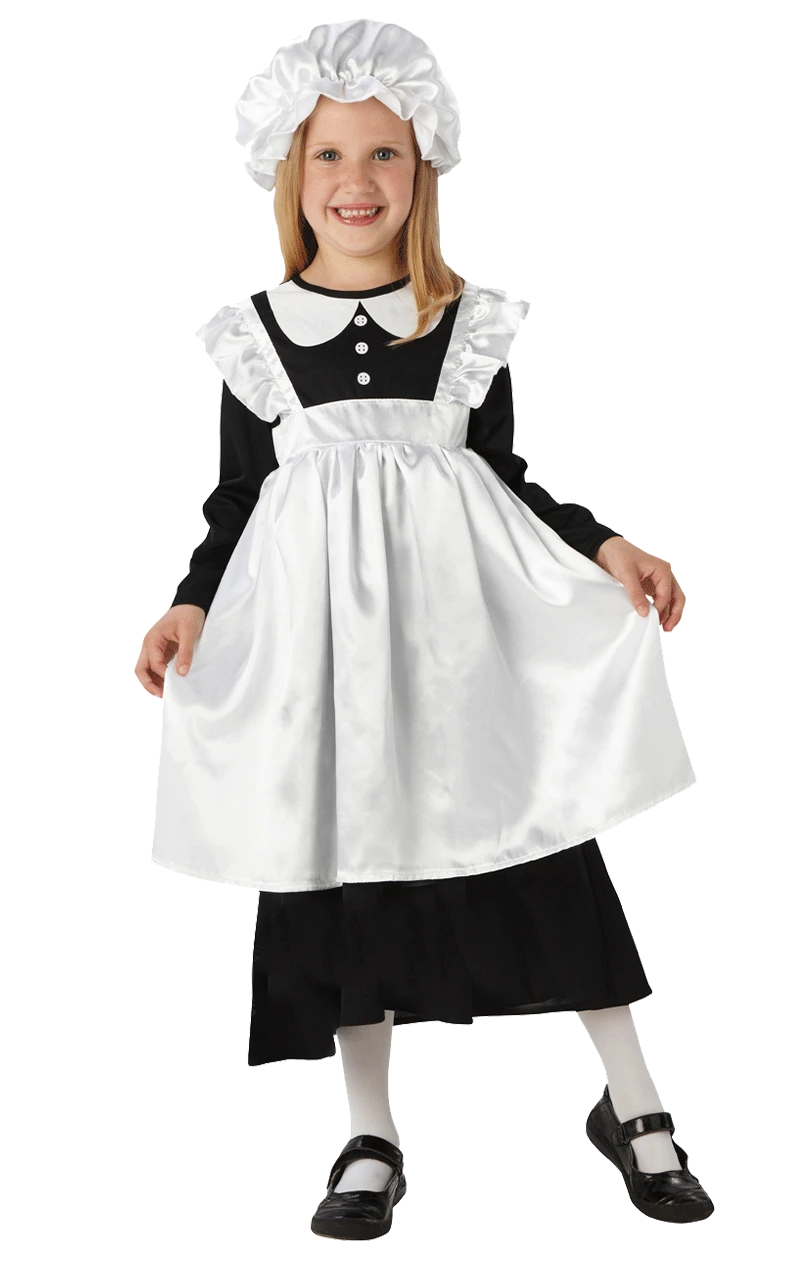 The Childrens Victorian Maid Costume includes a black dress with an incorporated white apron, a printed white collar and white button detailing.