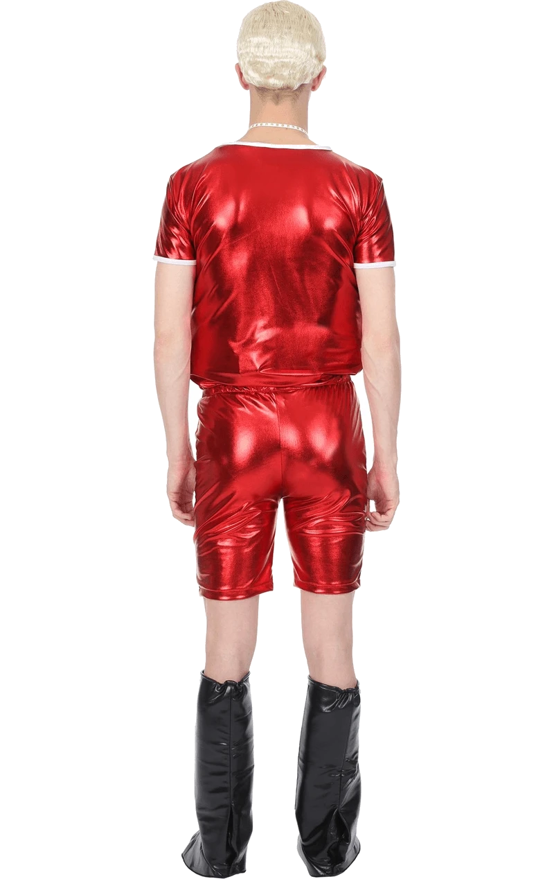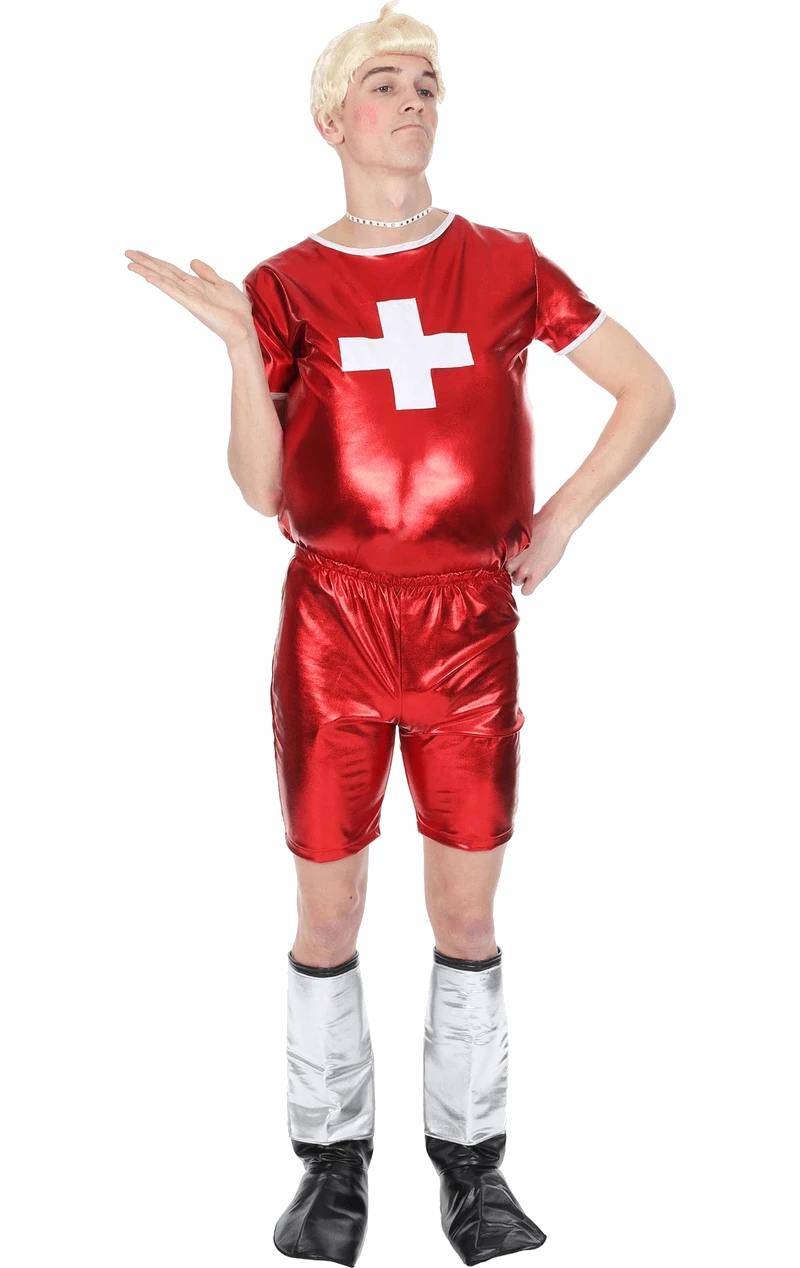 Let all the guests know you’re the only gay in the village dressed in this tight-fitting, metallic finish red shorts and a matching top with a printed white cross.