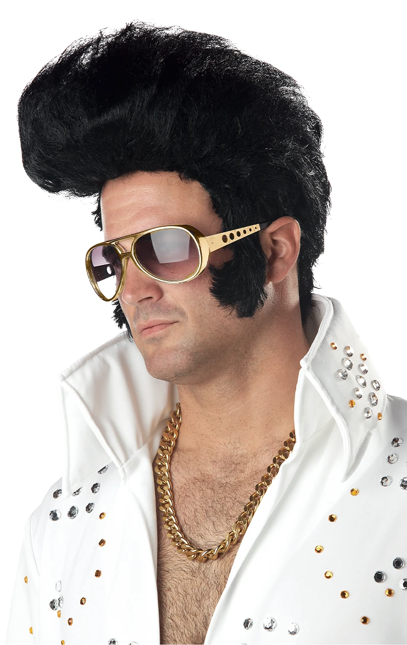 Fantastic deluxe black Elvis Presley style quiff wig. Add glasses and other accessories to complete the look.