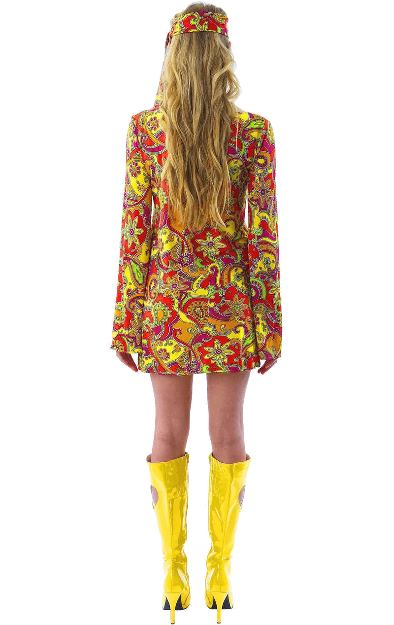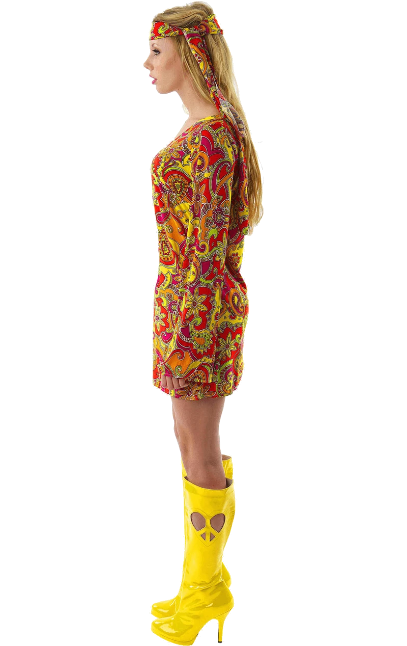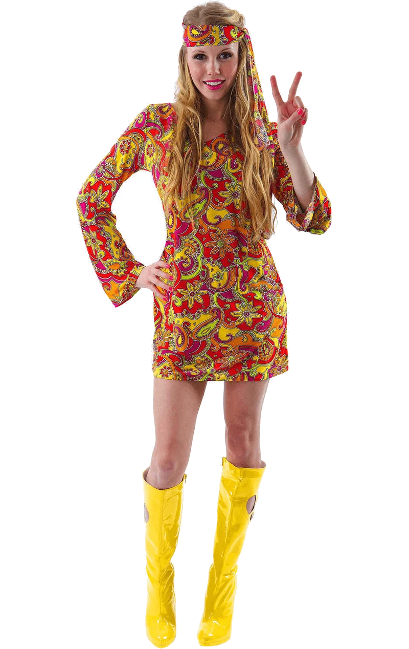 The Female 1960s Hippie Costume comes complete with a brightly coloured red and yellow patterned dress. The dress has a very unique design to it, featuring the classic flared sleeves that we’ve all grown to appreciate. The outfit includes a matching headband.