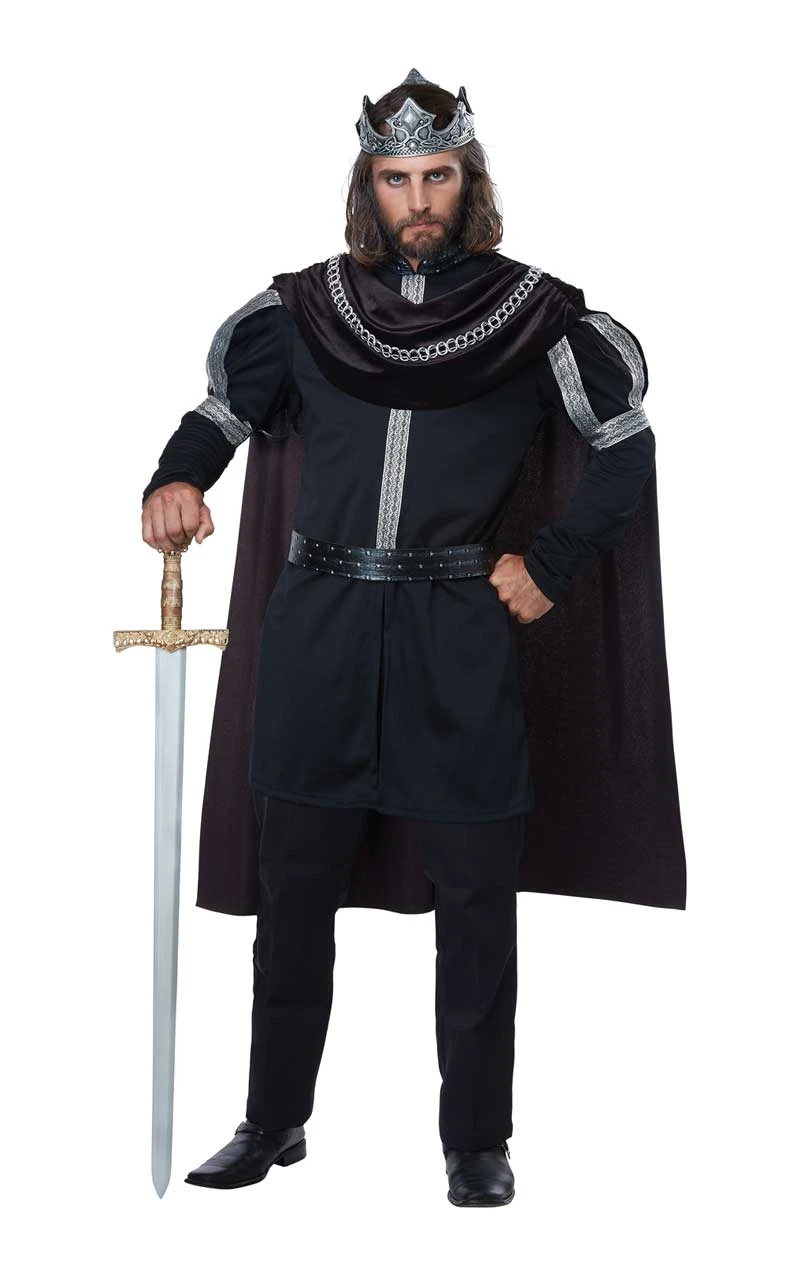 The Mens Dark Monarch Costume comes complete with a long, dark tunic top with silver trim detailing on the shoulder and front of the top. Also included is a matching black detachable cape, a silver chain that’s worn over the top, a black studded belt and a silver crown. You have everything you need to transform into a dark, evil king.