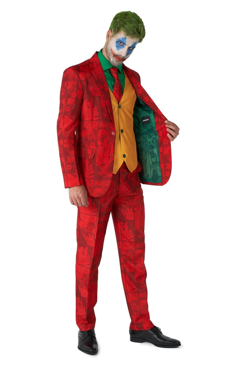 The Mens Scarlett Joker Opposuit Costume comes complete with a bright red blazer jacket featuring comic book like illustrations throughout. It also includes a matching skinny tie, a pair of trousers, and finally, a mustard-coloured waistcoat. Don’t forget to finish off your look with some of our costume face paint! Get creative painting the Joker’s signature smile.