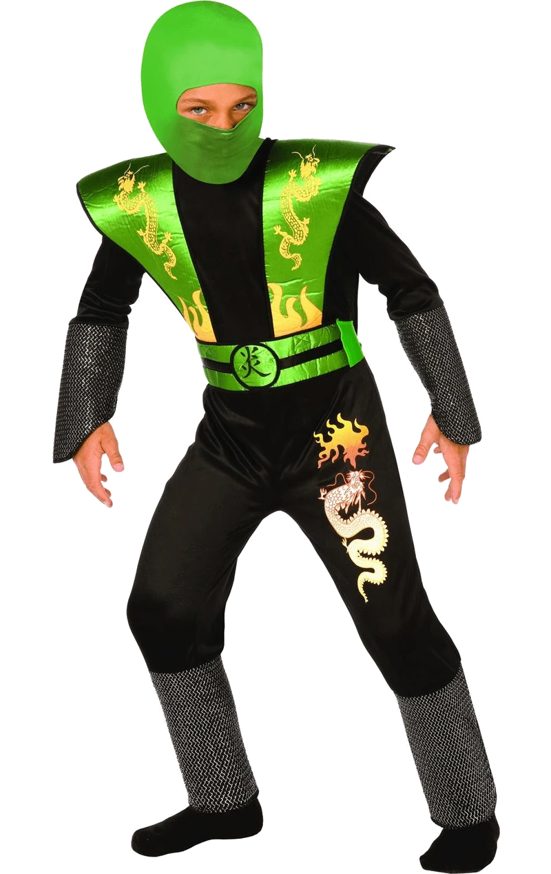 Our kid’s ninja costume comes with an all-in-one black bodysuit, an attached bright green vest with gold dragon patterns on the front and a green hood, so you boy will be a child of mystery!