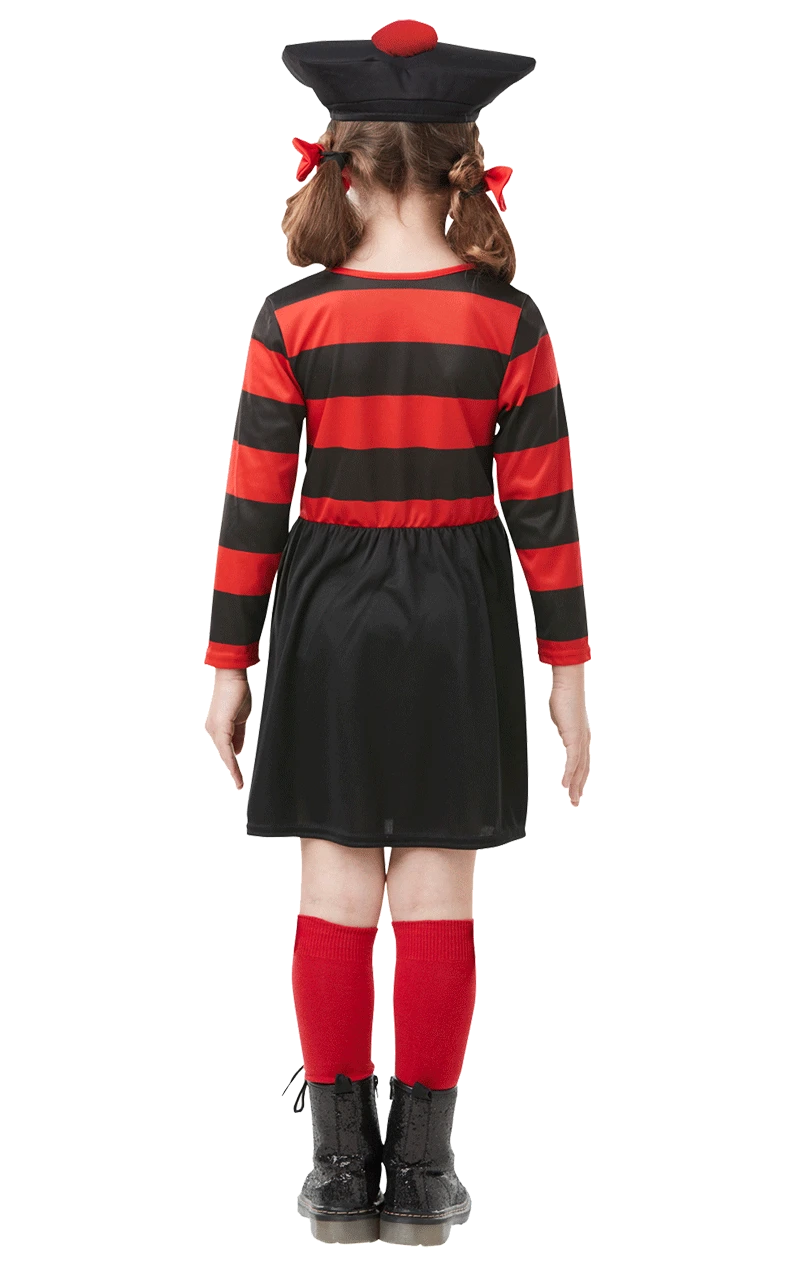 The Kids Minnie The Minx Costume features the iconic black and red striped dress with printed pea shooter, a pompom hat and red hair bows.