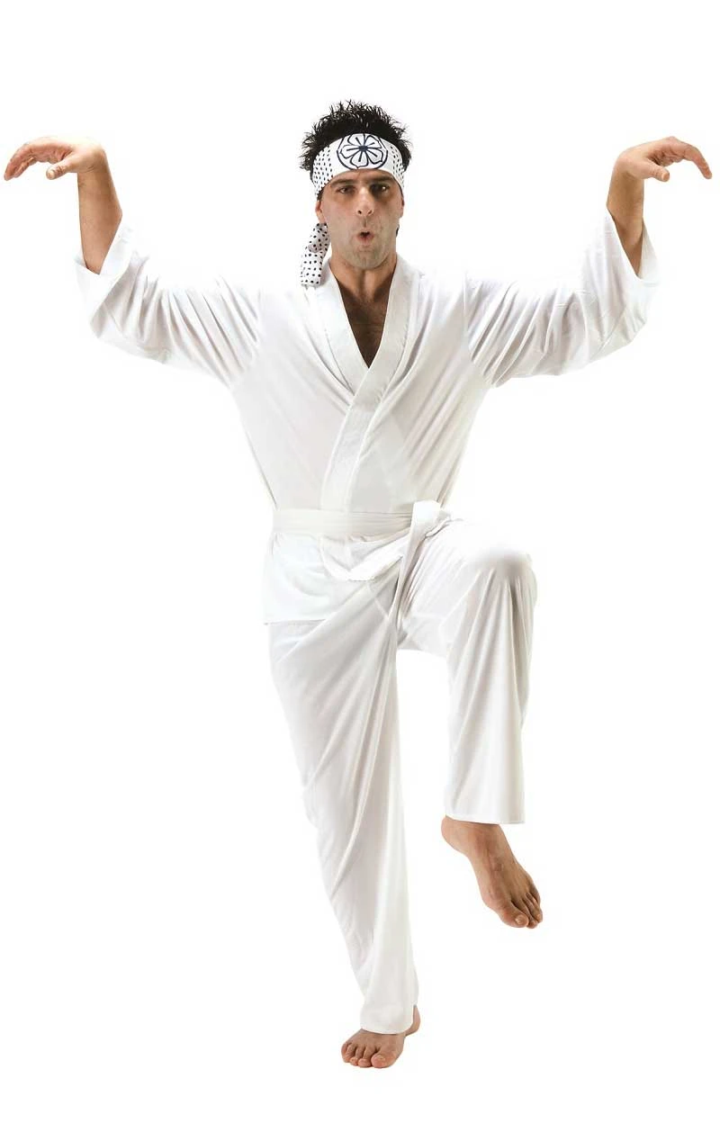 The Adult Daniel San Karate Kid Costume includes a white top, a matching pair of trousers, a black and white patterned headband and a white belt.