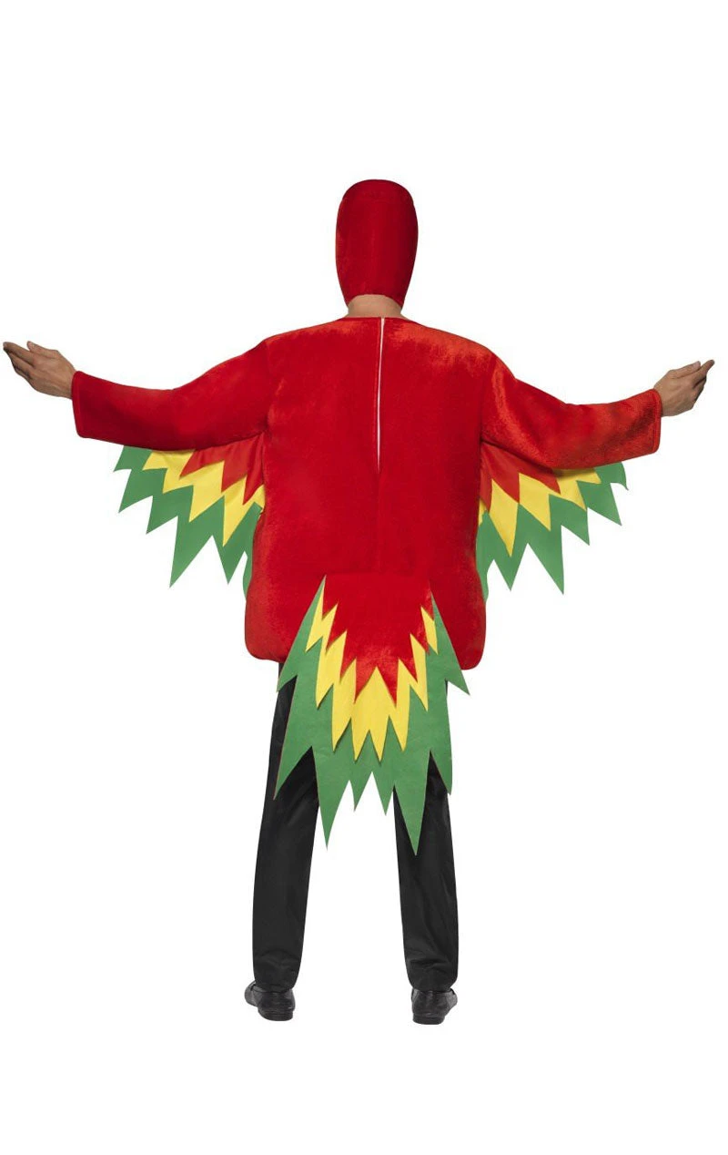 The Adult Parrot Costume includes a colourful red, yellow and green bodysuit with tail and wings. Also included is a matching red parrot headpiece with beak.