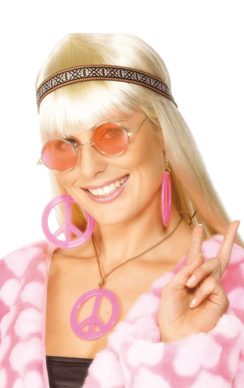 Spread the peace, love and unity in our Groovy Hippy Kit! This totally far out accessory pack includes a pair of rose tinted glasses, a peace pendant necklace with matching earrings and an aztec print headband.
