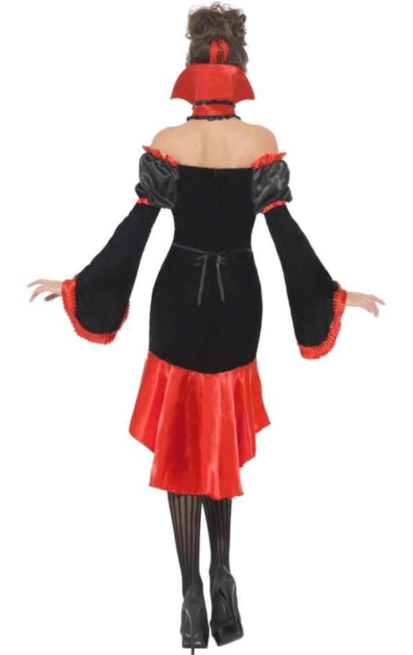 The Ladies Fever Boudoir Vampiress Costume includes a black and red dress with a longer skirt at the back, decorative ruffles and attached suspender straps.
