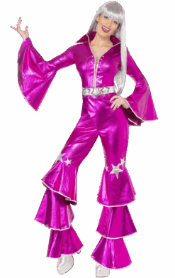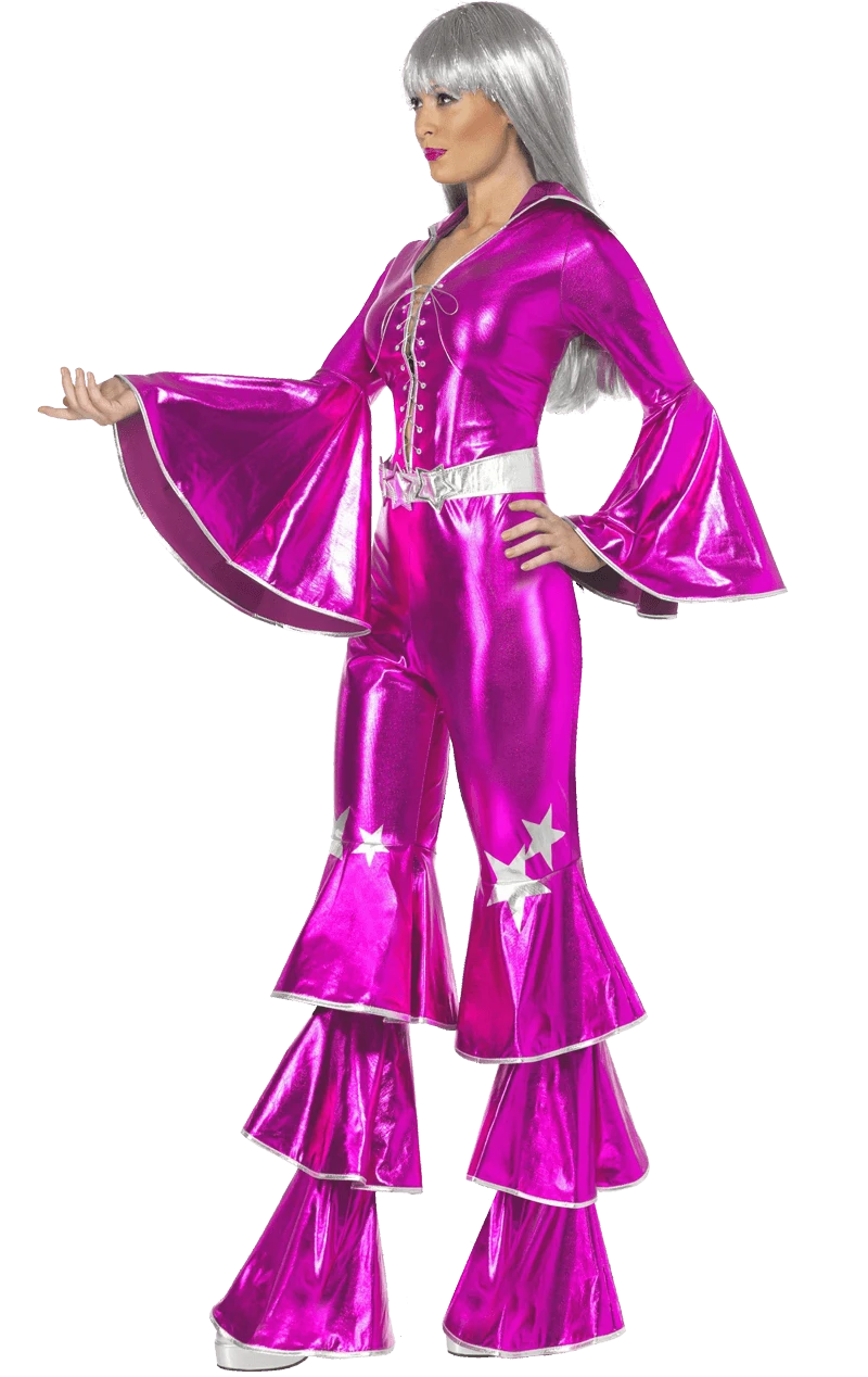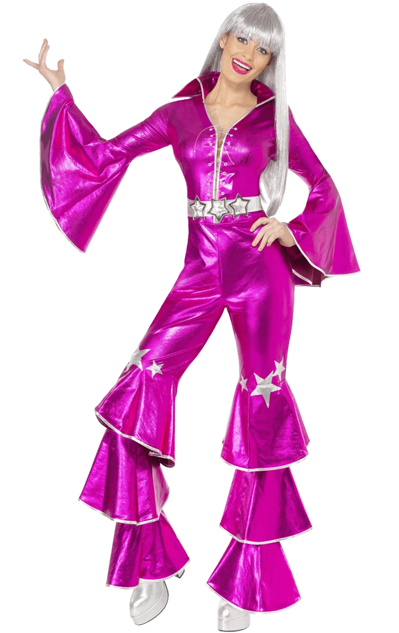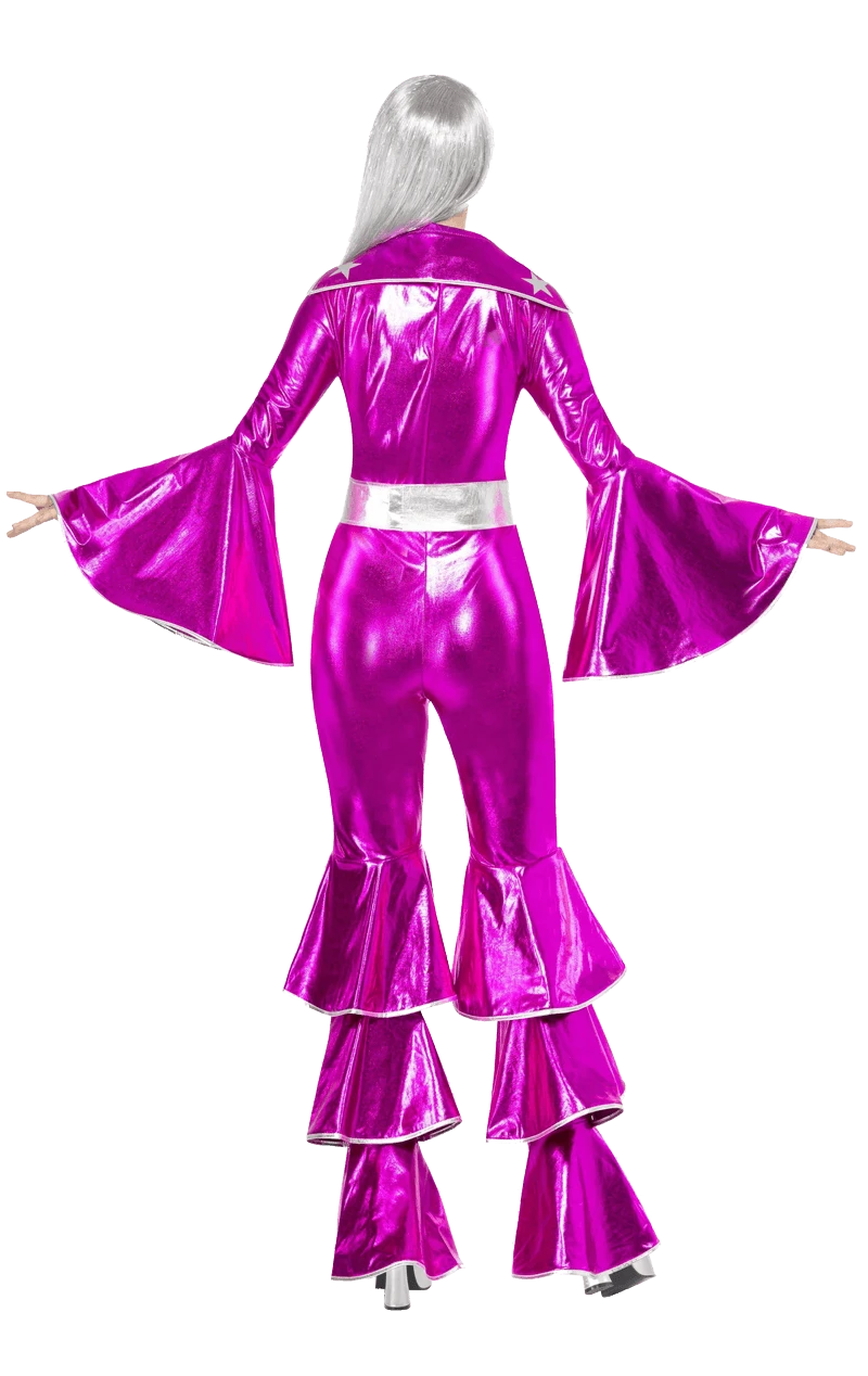 In this Pink Dancing Queen Costume, you’ll look like a superstar as you dance around in this metallic pink lace-up front jumpsuit with fluted and flared sleeves and trousers, and metallic silver star accents.