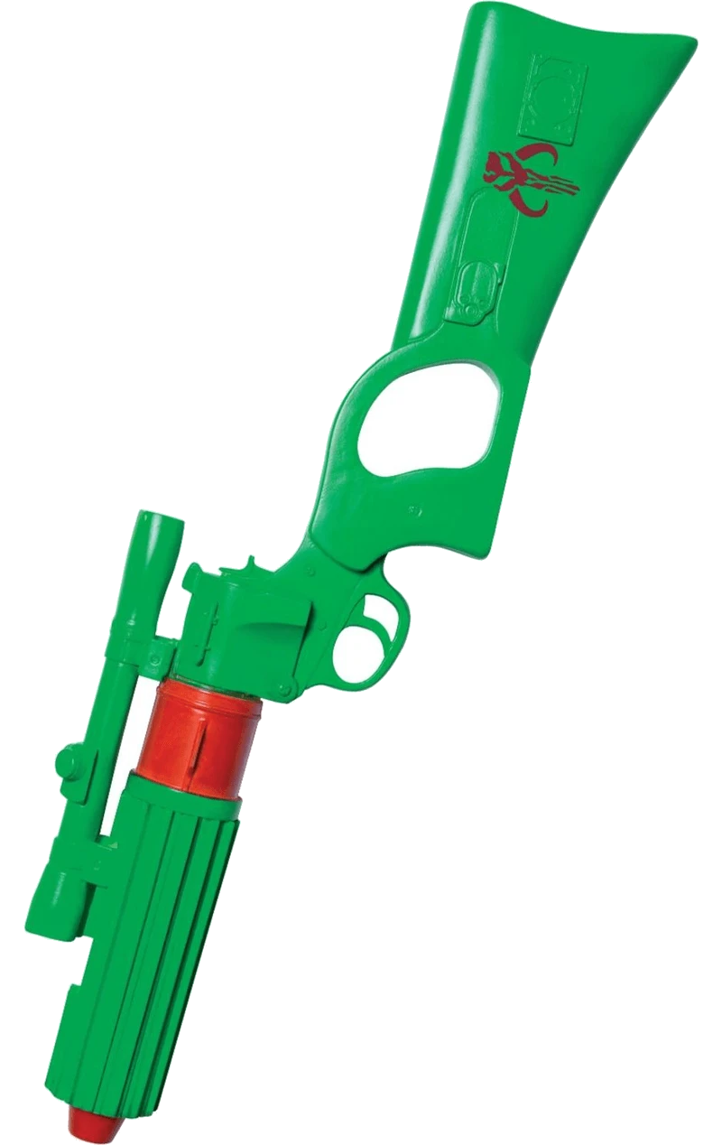 This officially licensed product features a red and green plastic blaster gun. Also printed onto the gun in red is a copy of the Mandalorian clan logo that Boba Fett was a part of.