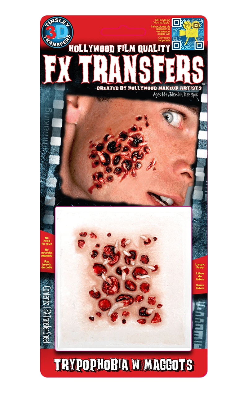 Get yourself a nightmare look this Halloween with our Trypophobia 3D FX Transfer tattoo. This holey, flesh-eaten, maggot ridden prosthetic is a wound that would make Freddie Krueger jealous. It’s a scary finishing touch for that horror serial killer look and what’s more, it’s easily applied with water – no messy glues needed!